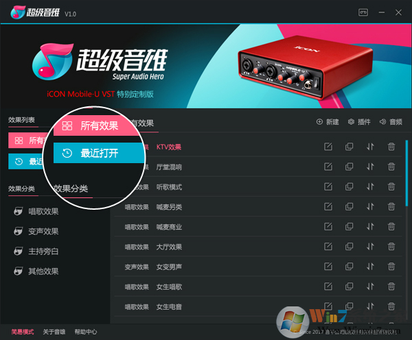 2.打開(kāi)超級(jí)音雄主界面,當(dāng)為簡(jiǎn)易模式時(shí),點(diǎn)擊常用效果按鈕,可在常用效果列表中查看已設(shè)置的常用效果,常用效果最多可設(shè)置5個(gè),如圖