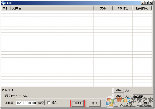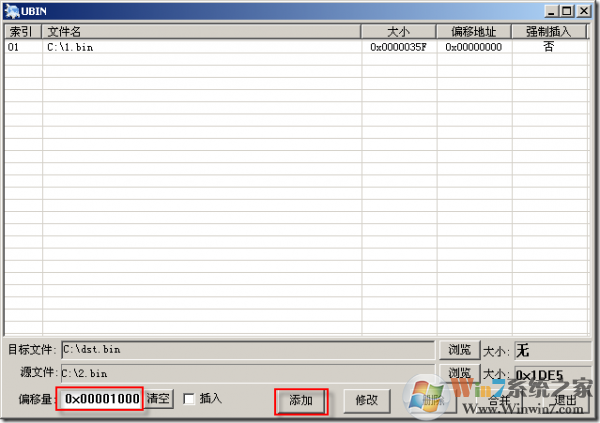 首先,添加第一個文件1.bin,其地址為0x0000,所以,偏移量設(shè)置為0x00000000,設(shè)置完偏移量后點(diǎn)擊“添加”按鈕。