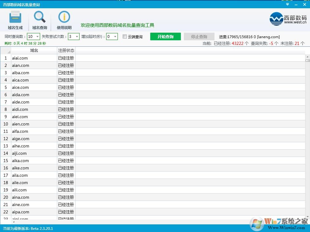 根據(jù)試用來看,該工具查詢的速度非常快,比網上很多需要下載安裝的軟件還快1倍以上。并且用戶還可以在使用界面中設置查詢線程,進一步提高查詢速度。該工具最大支持500萬個域名查詢隊列,完全可以滿足各種域名批量查詢注冊需求。