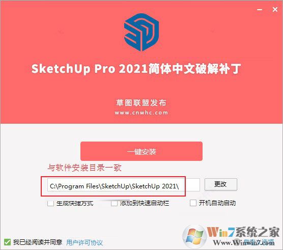 5、再運(yùn)行軟件包中的"2.SketchUp2021破解補(bǔ)丁.exe",安裝目錄需保持和軟件的一致;