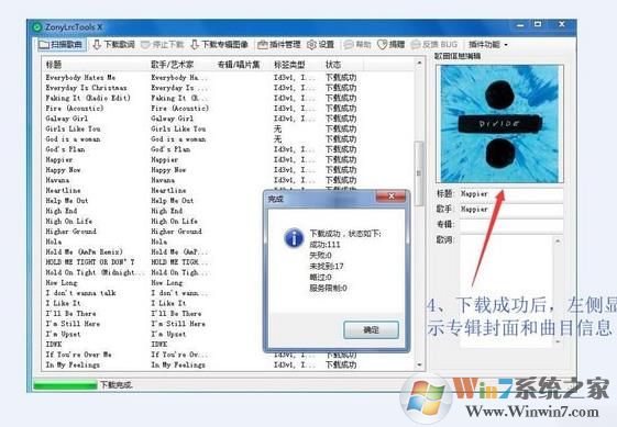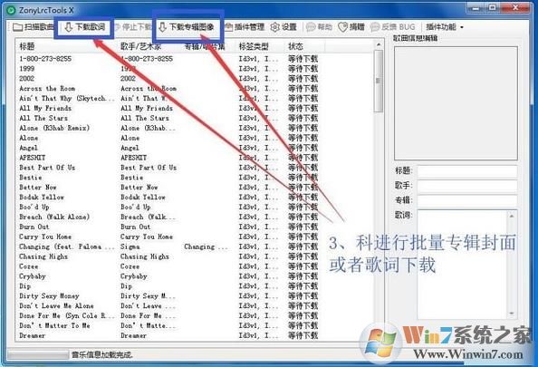 4、批量下載封面和歌詞之后,點(diǎn)擊歌曲,會(huì)在右邊顯示專(zhuān)輯圖像和歌曲信息。