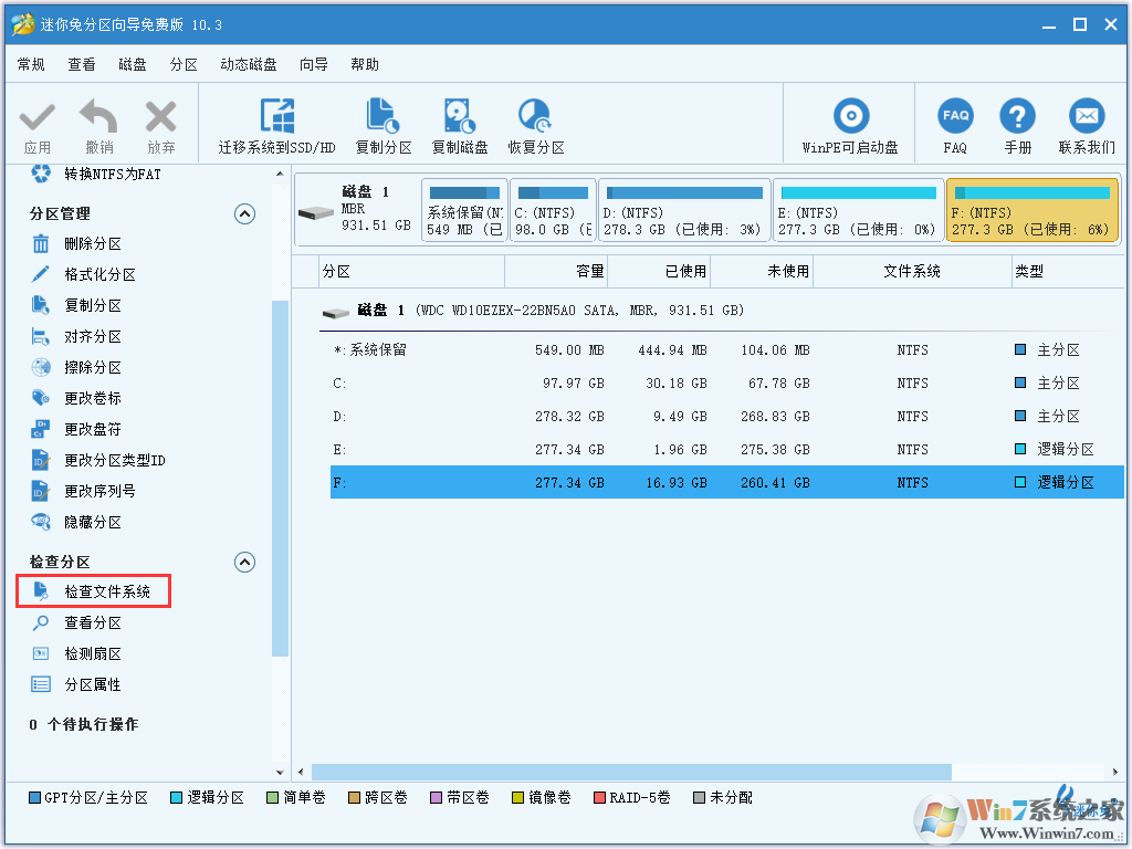 1、將迷你兔分區(qū)向?qū)拥狡渲鹘缑?,然后選擇目標(biāo)分區(qū),并從“檢查分區(qū)”組或“分區(qū)”菜單中選擇“檢查文件系統(tǒng)”。