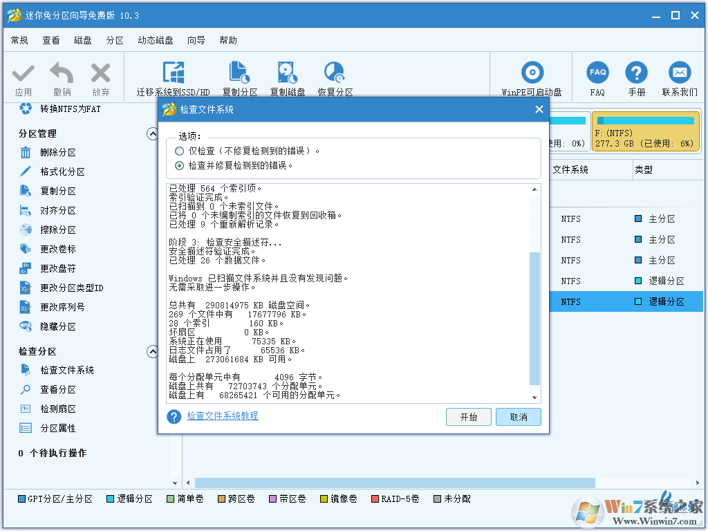 2、如果您想在檢查過程中修復(fù)錯誤,請選中“僅修復(fù)錯誤” 選擇“檢查并修復(fù)檢測到的錯誤”。然后,單擊“開始”按鈕,迷你兔分區(qū)向?qū)⒘⒓礄z查/修復(fù)文件系統(tǒng)。