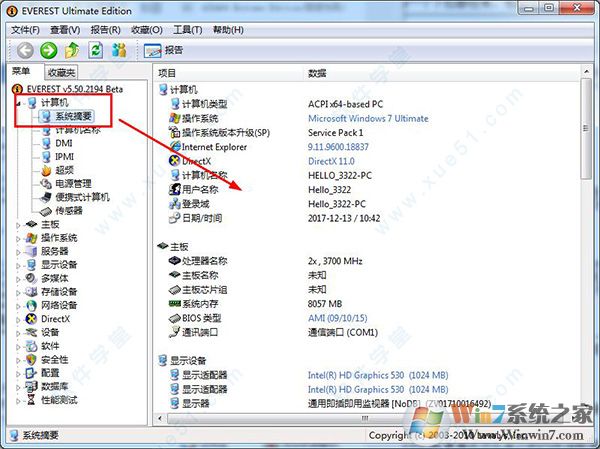 EVEREST Ultimate Edition 啟動后,首先要看的就是計算機“概述”,單擊“計算機”圖標可以打開“概述”。單擊“概述”后將在EVEREST Ultimate Edition 界面左邊顯示出我們計算機的一些詳細情況。如下圖所示,這里的信息比我們自己在電腦上查看的清楚得很。
