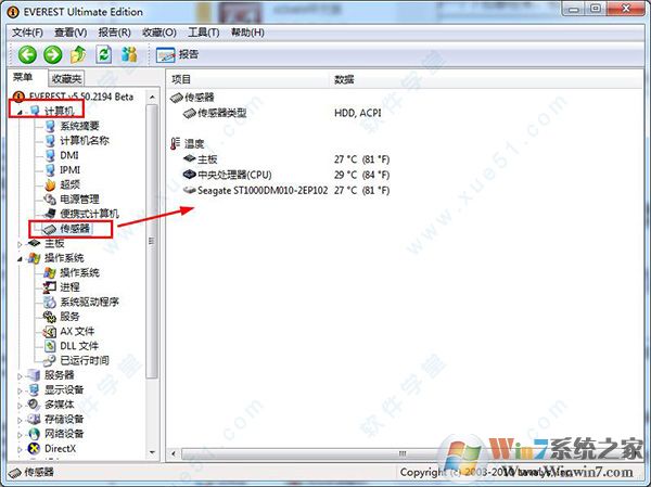還是在“計算機”里,點擊“傳感器”即可詳細顯示主板、CPU、硬盤的溫度及CPU的電壓。非常方便!其實我用此版本的EVEREST Ultimate Edition 時候,這些溫度在電腦的任務欄有顯示的!