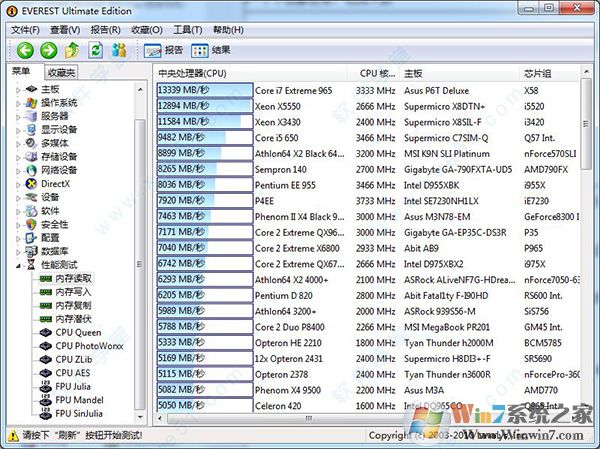 我舉例測試一下自己的內(nèi)存讀取性能,點擊“內(nèi)在讀取”,然后在右邊列表框里右擊-刷新,稍等即可查看自己的內(nèi)存讀取情況。你可以參考列表所給出的配置情況對比自己的內(nèi)存讀取速度排一個什么樣的位置。
