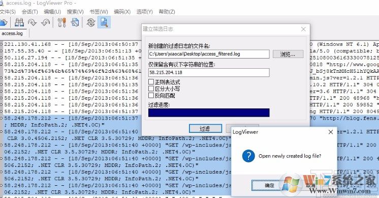 4.點擊過濾日志的話會出現(xiàn)下圖所示的界面,設置好篩選日志的參數(shù)之后點擊過濾按鈕,接著在出現(xiàn)的窗口中點擊確定按鈕即可。