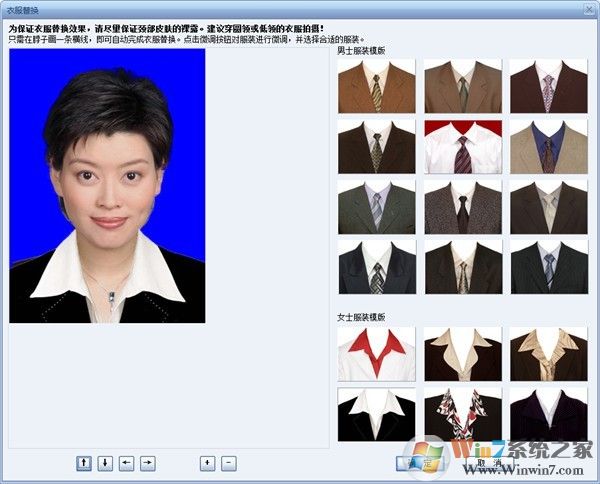 第五步、替換服裝。點擊【細(xì)節(jié)調(diào)整】,選擇【證照服裝替換】,在對話框中選擇一款服裝,在脖子處畫一條線,自動替換服裝,然后仔細(xì)調(diào)整好位置。
