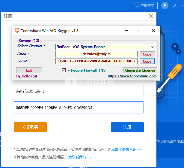 1???????安裝完成,運(yùn)行keygen,如圖所示,選擇本產(chǎn)品ReiBoot - iOS System Repair,點(diǎn)擊generate生成按鈕,在軟件中點(diǎn)擊鑰匙按鈕,將注冊(cè)信息復(fù)制到軟件中