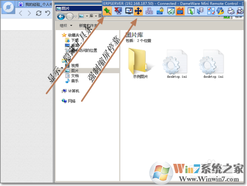 5、連接到被控制端后,軟件頂部會出現(xiàn)工具條,功能鍵是也圖形很形象的展現(xiàn),若不明白可以使用鼠標(biāo)移動到圖標(biāo)上面,會顯示此圖標(biāo)的功能說明。