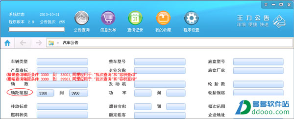 1、公告查詢、免征查詢、燃油查詢、環(huán)保查詢、CCC查詢 查詢條件包括(整車類型、整車型號、底盤型號、軸數(shù)、輪胎數(shù)、額定載客、燃油種類、排放標(biāo)準(zhǔn)、發(fā)動機、批次范圍、軸距范圍、罐體容積、產(chǎn)品商標(biāo)、企業(yè)名稱、企業(yè)地址、總質(zhì)量、額定質(zhì)量、整備質(zhì)量、整車長度、整車2、查詢條件包括(整車類型、整車型號、底盤型號、軸數(shù)、輪胎數(shù)、額定載客、燃油種類、排放標(biāo)準(zhǔn)、發(fā)動機、批次范圍、軸距范圍、罐體容積、產(chǎn)品商標(biāo)、企業(yè)名稱、企業(yè)地址、總質(zhì)量、額定質(zhì)量、整備質(zhì)量、整車長度、整車寬度、整車高度、廂體長度、廂體寬度、廂體高度)
