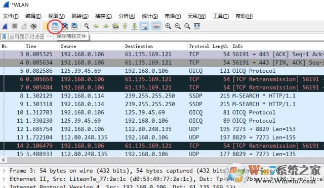 數(shù)據(jù)包采集完成后,可以像文件一樣保存,你也可以將這個(gè)保存后的文件傳給朋友,他們使用Wireshark依舊能夠打開(kāi)。這個(gè)常見(jiàn)的word文檔道理類似。