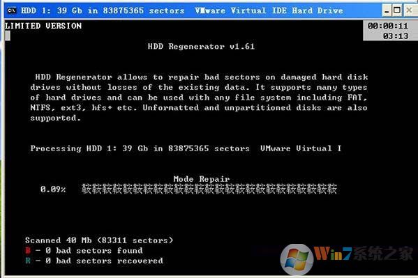 6、程序自動(dòng)掃描你選擇的硬盤,不用去管,當(dāng)HDD掃描到壞道后會(huì)在進(jìn)度條上顯示紅色的“B”字,隨后就開始自動(dòng)修復(fù),修復(fù)好的用藍(lán)色的“R”字標(biāo)注。掃描并修復(fù)完后就可以正常的是使用硬盤了