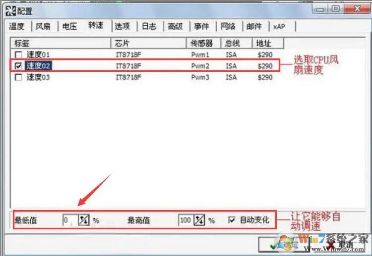 2. 然后,在speedfan中,點選“速度02”,因為這個是CPU風扇速度。在界面下方,勾選“自動變化”。并且,可以根據(jù)用戶自己的需要來調(diào)節(jié)CPU 風扇轉(zhuǎn)速的最低最高值。
