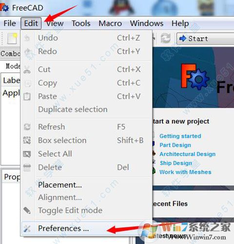 1、首次打開FreeCAD是英文界面的,我們需要在導(dǎo)航欄中,單擊“Edit”,選擇“preferences”。