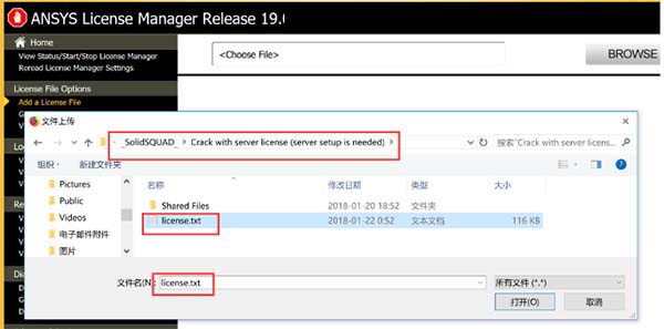 16.再次打開點ANSYS License Management Center,擊 "Add a License File" ,并添加_SolidSQUAD_\“Crack with server license (server setup is needed)目錄的的許可證文件“License.txt”