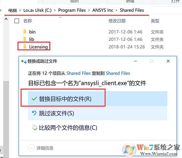14.下面開始破解了,解壓E:\MAGNiTUDE的里面的ansys191lm壓縮包,,將“Shared Files”內所有文件復制到打開ANSYS 19.0安裝根目錄下,并替代源文件,根目錄默認路徑為C:\Program Files\ANSYS Inc
