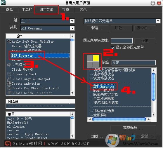 4. 彈出界面設(shè)置,選擇“四元菜單”,按圖設(shè)置,把“BFF_Exporter”拖入到右鍵快捷列表內(nèi),見(jiàn)下圖!