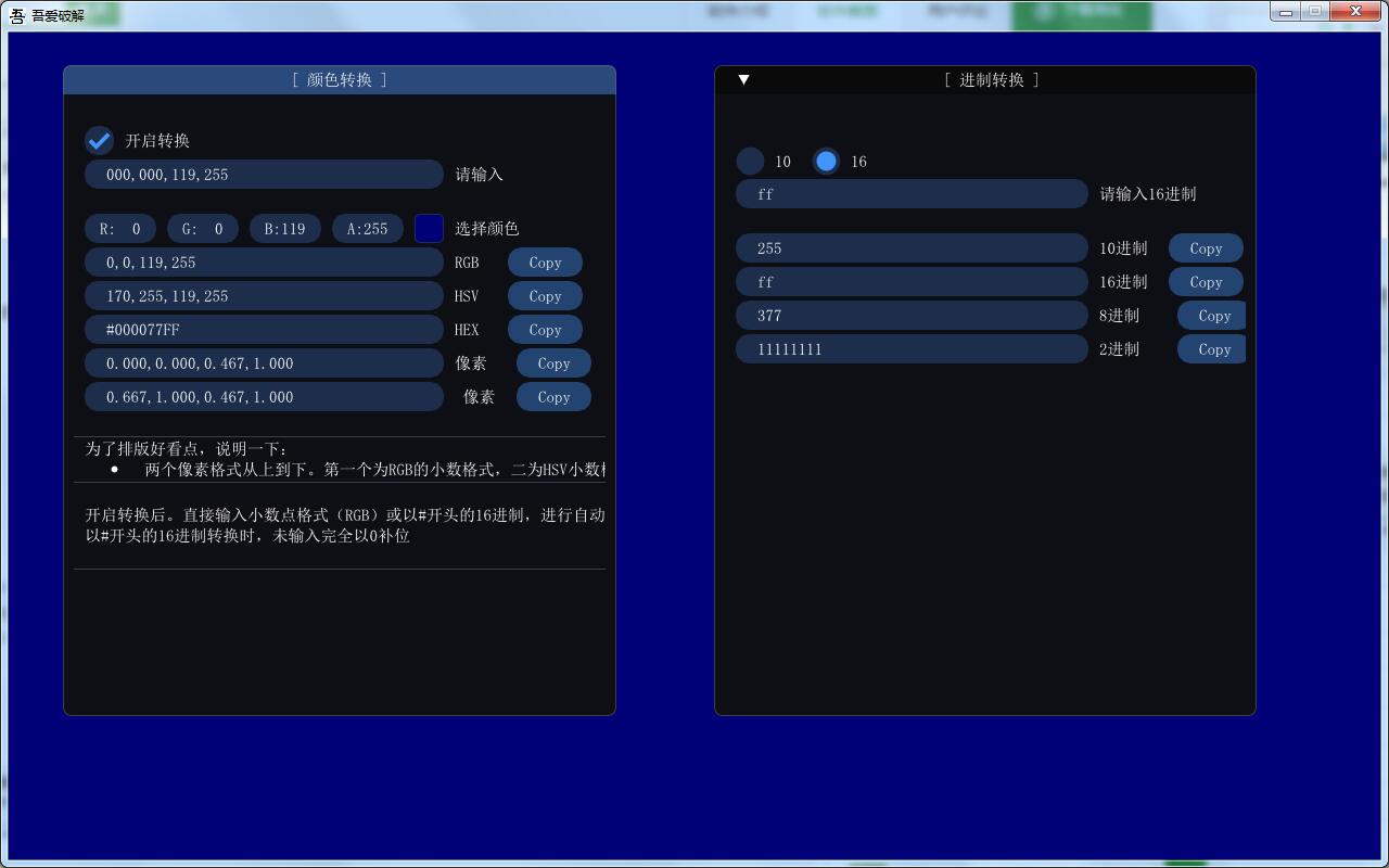 顏色轉(zhuǎn)換器是一款由大神制作的電腦顏色轉(zhuǎn)換工具,開啟轉(zhuǎn)換后。直接輸入小數(shù)點(diǎn)格式(RGB)或以#開頭的16進(jìn)制,進(jìn)行自動(dòng)以#開頭的16進(jìn)制轉(zhuǎn)換時(shí),未輸入完全以0補(bǔ)位。這款顏色轉(zhuǎn)換器支持顏色轉(zhuǎn)換,支持進(jìn)制轉(zhuǎn)換,對(duì)于進(jìn)行工程制圖的用戶來說是非常方便的一款下工具,每個(gè)像素的元素都可以轉(zhuǎn),非常的給力!