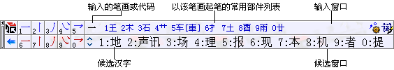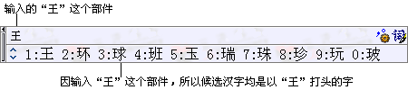 | 部件選取的順序以漢字筆順為準(zhǔn),即按筆畫輸入到有部件時(shí)就進(jìn)行部件的輸入。 如:"現(xiàn)"字,"王"為一部件,首筆為"一",輸入6,"王"便出現(xiàn)在輸入框中,序號(hào)為1(圖一),所以輸入1(也可以直接用鼠標(biāo)點(diǎn)擊),這就完成"王"部件的輸入(圖二);然后再輸入下一筆"丨",代碼2,"現(xiàn)"便出現(xiàn)在候選漢字第一位(圖三),按回車或空格完成輸入。"現(xiàn)"的代碼為612。 |