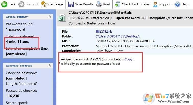 2、不過(guò)office2019創(chuàng)建的后綴是“.xlsx”文件同樣的密碼軟件預(yù)測(cè)要4個(gè)小時(shí),而EXCEL 97-2003格式的后綴“.xls”格式只要4分鐘多一點(diǎn),密碼都是5位純數(shù)字