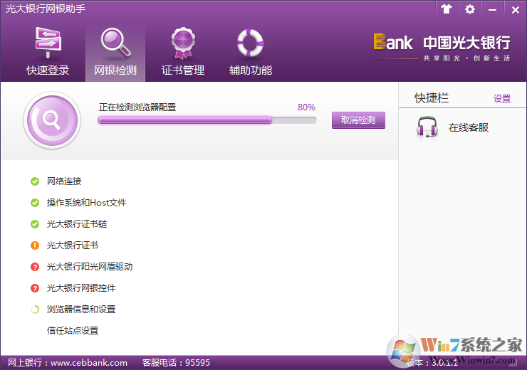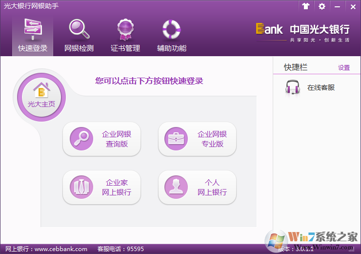 光大銀行網(wǎng)銀助手是光大銀行官方專為本行用戶推出的一款網(wǎng)上銀行環(huán)境設(shè)置工具,可以全面的檢測用戶的網(wǎng)上銀行使用環(huán)境,有效的防止各種因為木馬或者病毒導(dǎo)致的網(wǎng)銀信息泄露,有效的保護(hù)了大家的網(wǎng)銀安全,放心交易!
