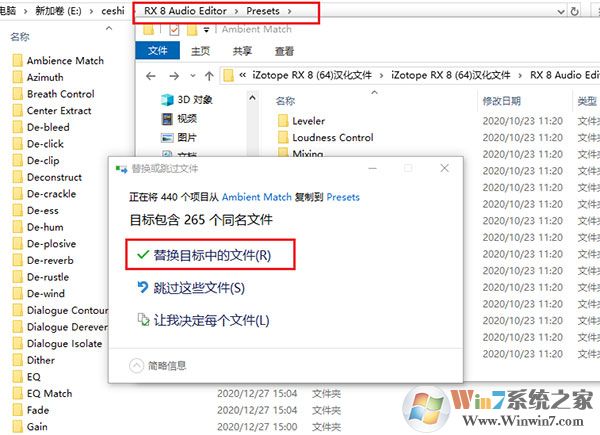 7、接著對軟件進行漢化破解,打開解壓之后的漢化文件夾,在打開“RX 8 Audio Editor”文件夾,找到presents文件夾,再將最里面的44個文件夾復(fù)制到軟件安裝的【\RX 8 Audio Editor\Presets】路徑下,替換原來的文件,參考下面圖片: