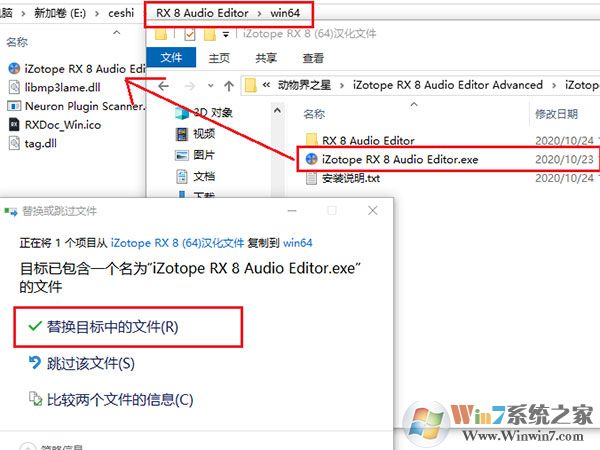 8、完成以上文件復(fù)制替換之后,在返回漢化文件夾,將“iZotope RX 8 Audio Editor.exe”文件復(fù)制到軟件安裝的路徑下,并進行替換,參考下面圖片: