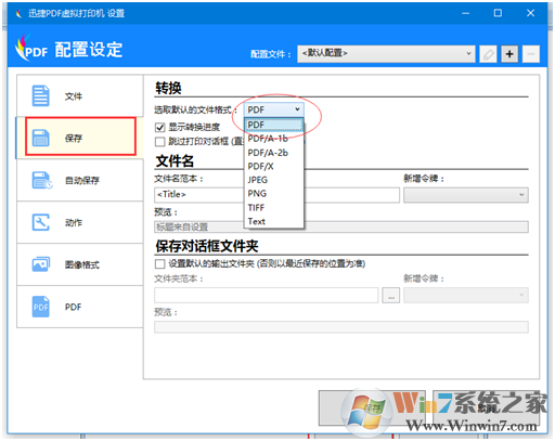 三、在“保存”中設(shè)置我們要將文檔轉(zhuǎn)換的格式如PDF(圖中紅框以及紅圈所示),選擇完成之后點(diǎn)擊右下角保存按鈕。