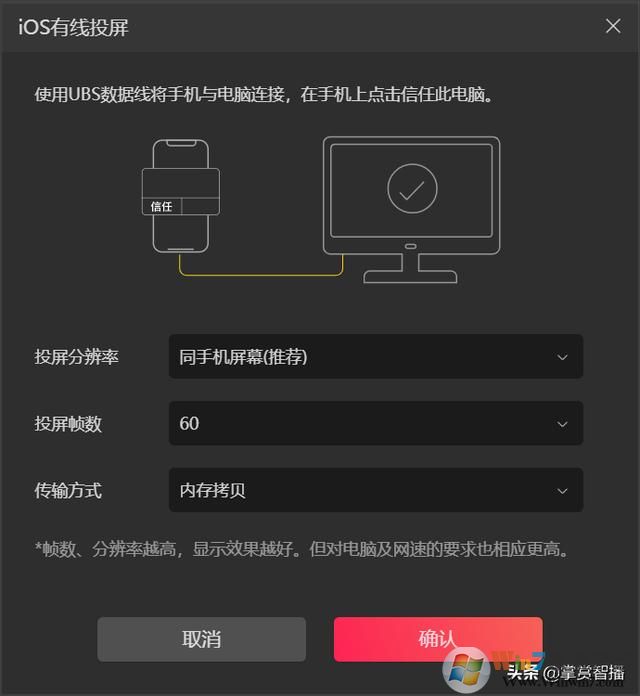 IOS投屏為有線投屏,需要根據(jù)窗口提示,在手機(jī)上信任此電腦。
