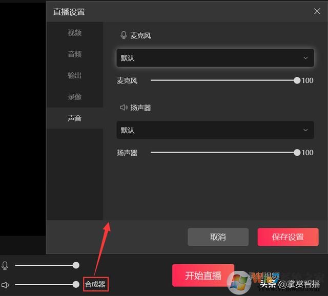 點(diǎn)擊【合成器】后,可以打開直播音頻設(shè)置窗口。此窗口中,我們可以更改要使用的麥克風(fēng)設(shè)備、揚(yáng)聲器設(shè)備,如果沒有聲音的時(shí)候,可以使用此功能切換一下設(shè)備反復(fù)嘗試,直到有聲音。