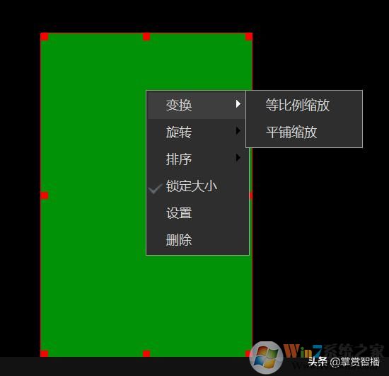 同時(shí),右鍵素材后,我們可以使用變換、旋轉(zhuǎn)、排序等多種功能。變換中支持等比例縮放、平鋪縮放(無視源比例);旋轉(zhuǎn)中支持90°、180°、垂直翻轉(zhuǎn)和水平翻轉(zhuǎn);排序功能與在場(chǎng)景素材模塊中,拖動(dòng)素材上下位置起到的作用相同。
