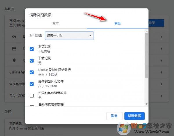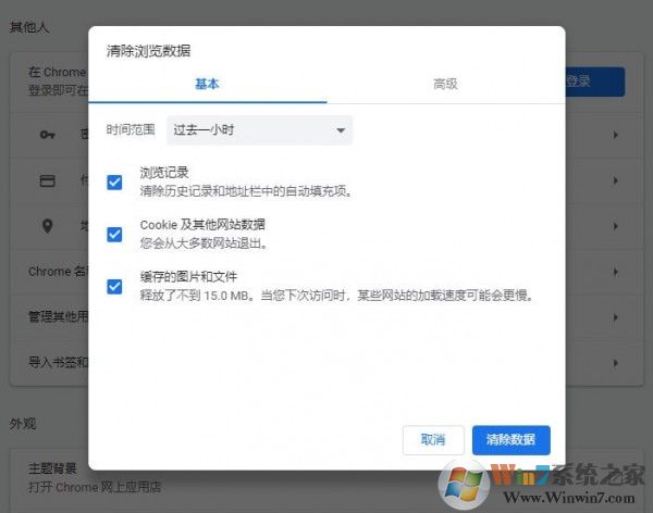 2、點(diǎn)擊之后,“清除瀏覽數(shù)據(jù)”的對(duì)話框?qū)?huì)彈出。有基本和高級(jí)兩個(gè)選項(xiàng)欄,基本選項(xiàng)中可清除瀏覽記錄、緩存、cookie等基礎(chǔ)數(shù)據(jù),選擇高級(jí)選項(xiàng)可清除更多緩存數(shù)據(jù)。