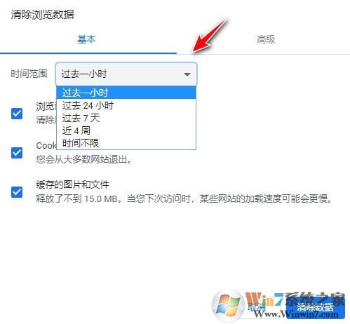 3、還可以選擇設(shè)置需要清除緩存的時(shí)間,可以選擇“過去一小時(shí)”,“過去的日子”,“過去一周”和“最后4個(gè)星期。”在這幾個(gè)選項(xiàng)中選擇任何一種,都只能清除所選時(shí)間范圍內(nèi)產(chǎn)生的緩存。