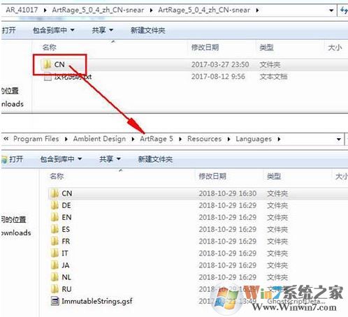 安裝完成之后,ArtRage_5_0_4_zh_CN-snear目錄下的CN文件夾復(fù)制到軟件安裝目錄的Languages文件夾中,即可完成漢化,如圖: