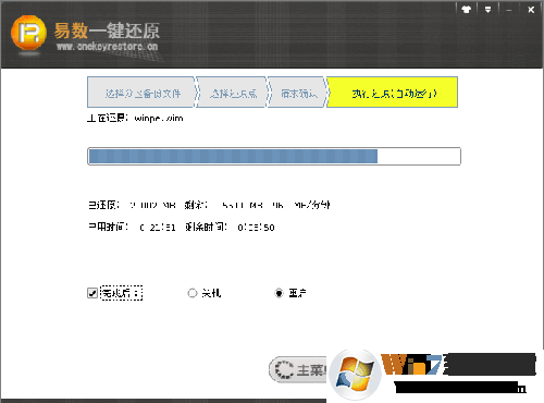 該程序的還原速度比備份速度還要快!如果您沒(méi)有修改還原時(shí)默認(rèn)的還原完成后的操作選項(xiàng),軟件還原完系統(tǒng)后,又會(huì)自動(dòng)重新啟動(dòng)到Windows。