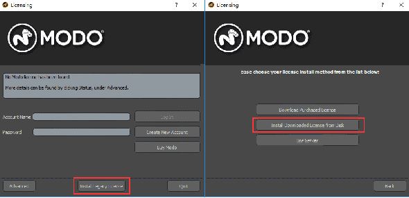 運行軟件,在許可證配置界面,依次選擇Insatall Legacy License——>Insatall Downloaded License from Disk在出現(xiàn)的提示框中雙擊modo492947.lic許可證文件即可,如圖: