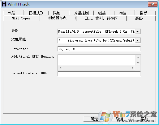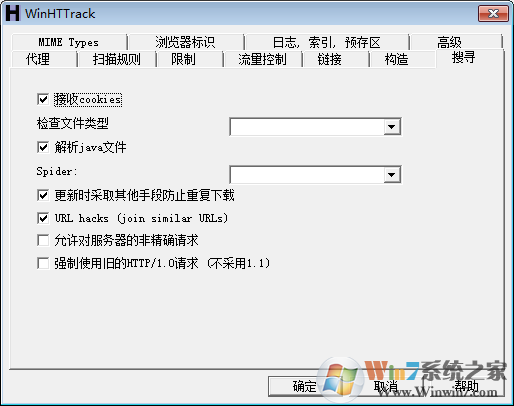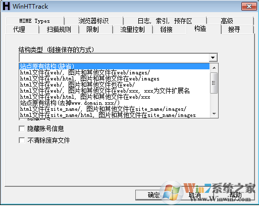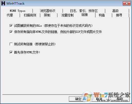 5、鏈接我選擇了試圖捕獲所有的URLs,保存所有指向非HTML文件的鏈接,例如外部的zip文件或圖片文件,首先保存HTML文件,取默認(rèn)也行,沒看出多少區(qū)別。