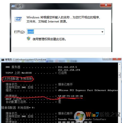 一、首先查出物理地址。這里我們需要首先找到自己電腦的物理地址,點(diǎn)擊“開始”的運(yùn)行(或Windows鍵+R),輸入cmd回車;在命令提示框里輸入ipconfig/all回車,就可以找到自己的物理地址(MAC)了,如圖所示: