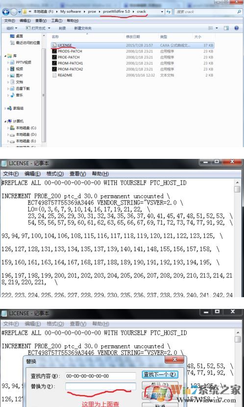 二、更換物理地址。以記事本的方式打開crack文件夾下的license.dat文件,將所有的00-00-00-00-00-00替換為上面所查出的物理地址,然后保存,這樣就可以直接運(yùn)行proe.exe了,如圖所示: