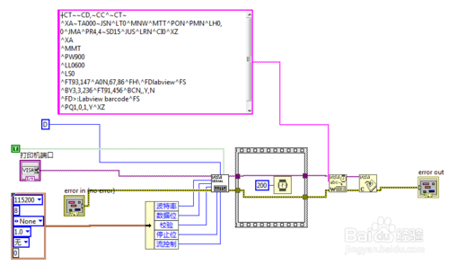 復(fù)制PRN文件中的文本內(nèi)容,在labview中創(chuàng)建如圖所示的程序框圖,將復(fù)制的文本內(nèi)容粘貼在字符串常量中,選擇打印機(jī)的串口,運(yùn)行該VI就能打印出我們需要的標(biāo)簽了。