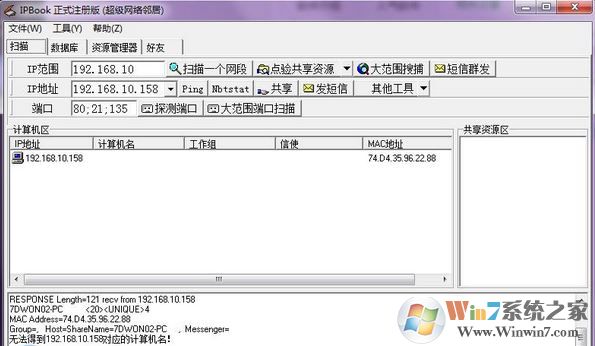 3、查隨意網(wǎng)段的全部設(shè)備的計(jì)算機(jī)名與資源共享。你可以將本網(wǎng)段的IP地址詳細(xì)地址擴(kuò)張改為你愿意搜索的范疇。如以xX.xX.xX的方式顯示信息的就是說(shuō)網(wǎng)段范疇。以后點(diǎn)一下掃描儀1個(gè)網(wǎng)段”和“點(diǎn)驗(yàn)資源共享”這2個(gè)按鍵,能夠查出來(lái)計(jì)算機(jī)名與資源共享。如果申請(qǐng)注冊(cè)得話,你能大范疇地搜一起你可以檢索隨意范疇的計(jì)算機(jī)名,工作組,Mac詳細(xì)地址及資源共享等等等等。