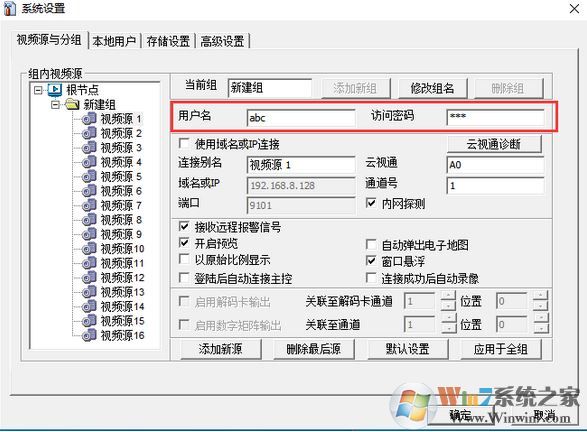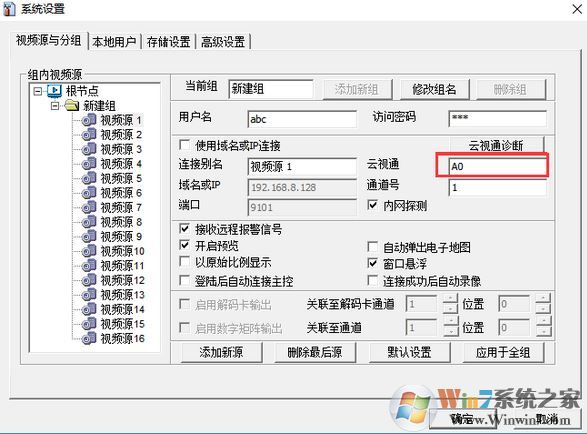 隨后根據(jù)前端開發(fā)設備的類型選擇視頻源數(shù)量,然后點擊應用于全組,該云視通手機號碼就應用到整個視頻源了。