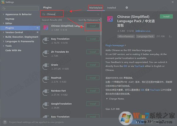 9.在marketplace的搜索框中輸入“Chinese”,找到漢化插件“chinese(simplified) langua...”在點(diǎn)擊“install”進(jìn)行安裝