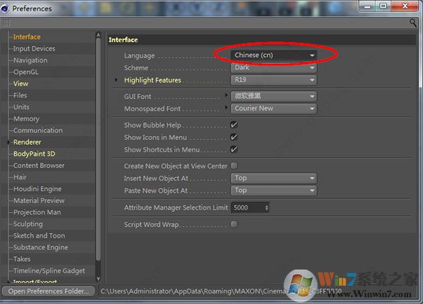 9、安裝完成后運(yùn)行桌面快捷方式,Cinema 4D R20默認(rèn)為英文界面,使用快捷鍵Ctrl+E打開(kāi)設(shè)置界面,將Language項(xiàng)修改為“Chinese(CN)”簡(jiǎn)體中文,然后重新運(yùn)行軟件即可