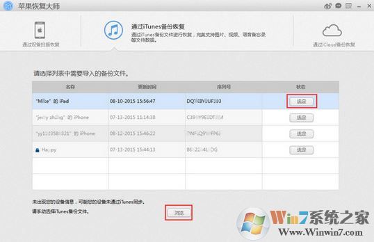 第二步:選擇想要恢復(fù)的備份數(shù)據(jù),點(diǎn)擊【選中】。若未出現(xiàn)設(shè)備信息,可點(diǎn)擊正下方的【預(yù)覽】手動式選擇 iTunes 備份數(shù)據(jù)。