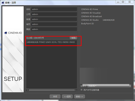 6、然后回到安裝界面,將個人信息補全,將Cinema4D R18序列號復(fù)制入內(nèi)
