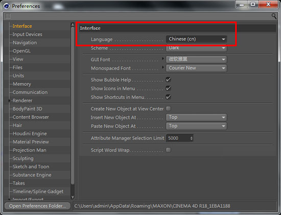 Cinema4D R18的默認語言為英文,我們需要手動進行設(shè)置。首先,確定安裝中文語言包后,打開CINEMA 4D,然后通過CTRL+E鍵彈出設(shè)置界面,在Language中選擇Chinese,然后重啟軟件即可。