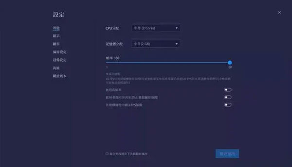 支持CPU核心、內(nèi)存、幀率、垂直同步設(shè)置等硬件分配。