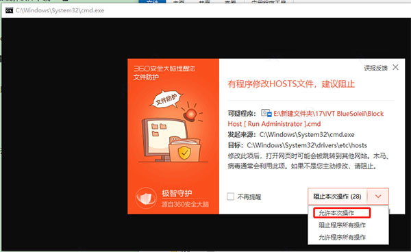2、右鍵選擇"Block Host [ Run Administrator ].cmd"以管理員身份運(yùn)行,然后允許該程序進(jìn)行操作,這是為了修改hosts文件來(lái)更好的利用注冊(cè)表來(lái)進(jìn)行破解;